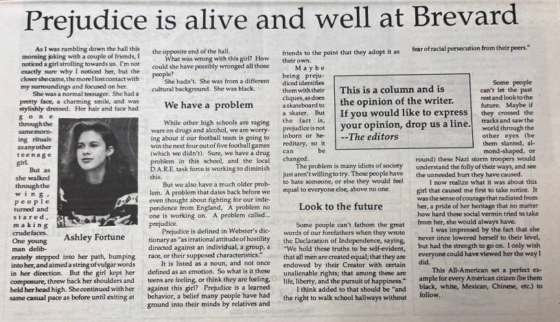 It also included a column on prejudice, which its headline declared was “alive and well at Brevard.” Staff writer Ashley Fortune wrote about a time when she saw a girl walking down the hallway only to be met with stares, students making faces, and even one student bumping into her and saying “a string of vulgar words.”