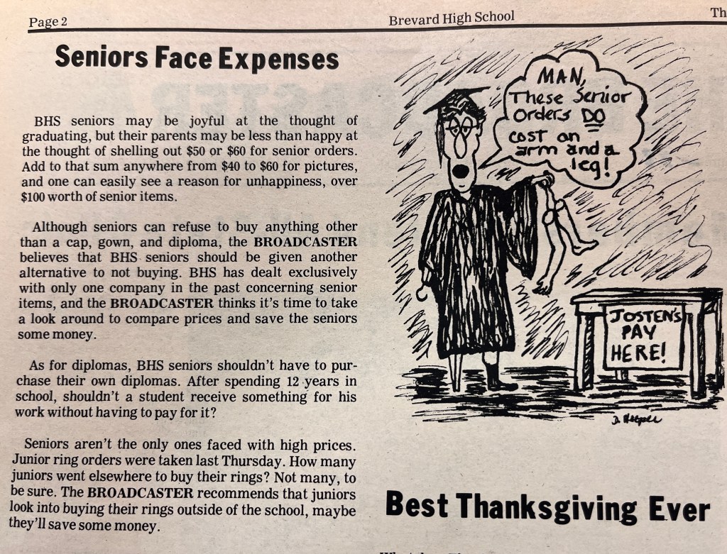 The Thursday, Nov. 21, 1978 edition of The Broadcaster detailed the expenses seniors faced when graduating. It listed “$50 or $60 for senior orders. Add to that sum anywhere from $40 to $60 for pictures…”