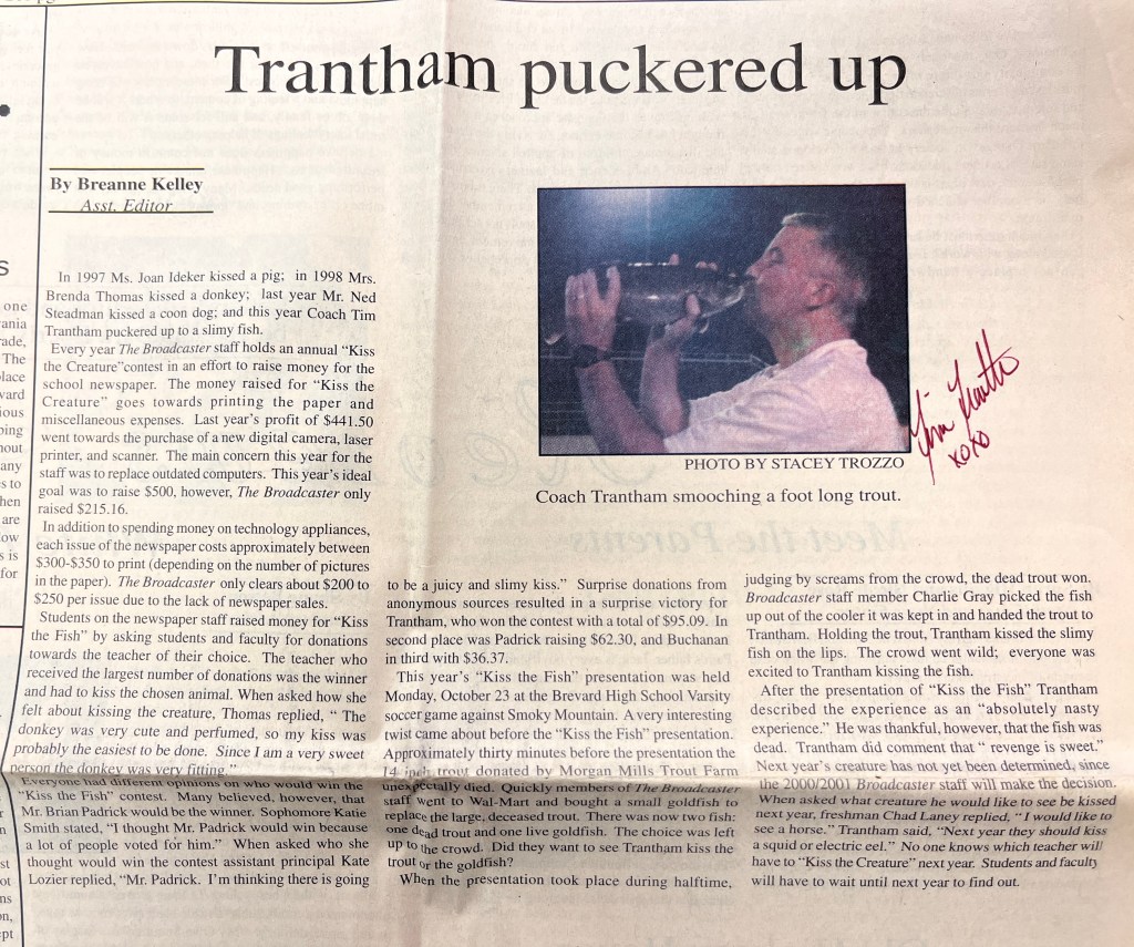 Perhaps the most amusing article is an autographed, front-page feature on Coach Tim Trantham kissing a foot-long trout. In those days, The Broadcaster held an annual contest called “Kiss the Creature” as a fundraiser for the newspaper. Students and staff donated money toward the teacher they wanted to kiss the creature chosen for that year, and the teacher with the most donations was the “winner.”