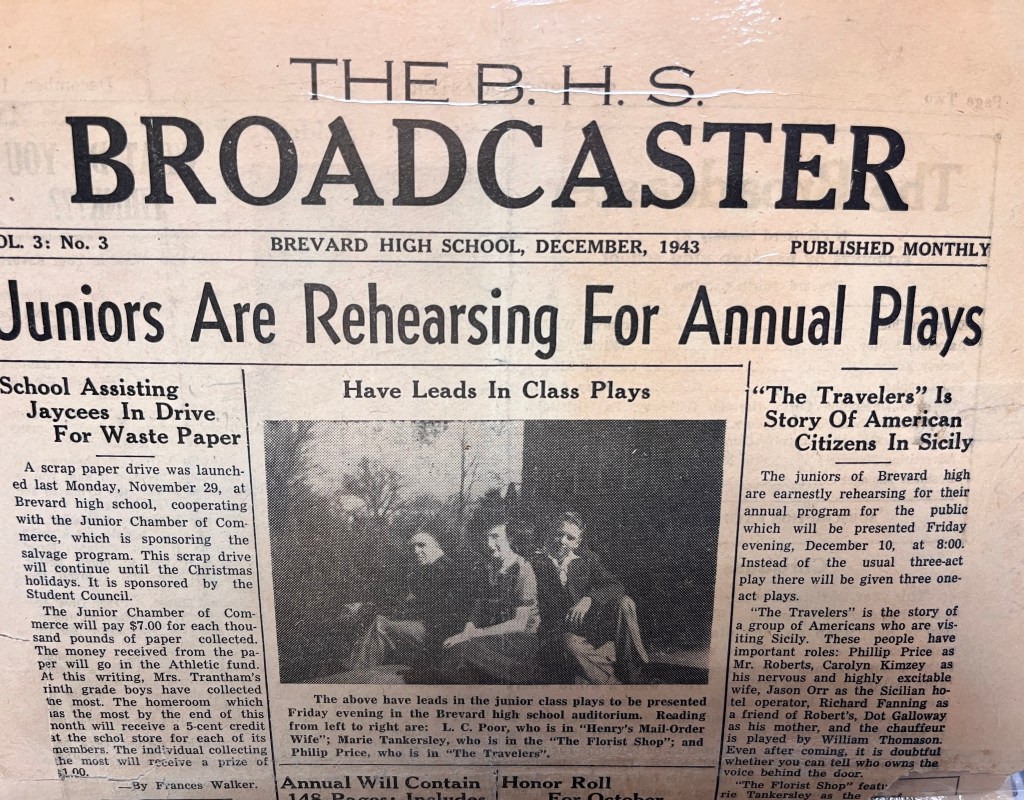 A November 1943 edition could not be found in the archives, but the December 1943 edition recounts a football game between Brevard High and the Brevard College Tornadoes, in which BHS lost 25-0. BHS then lost its second game of the season before tying 0-0 with Biltmore in its third game. The team went on to score touchdowns in later games.
