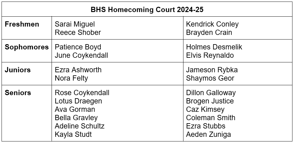 Congratulations to the 2024-25 Homecoming Court! Members of the court were introduced to the student body, staff and community today, Nov. 7, during a presentation in the auditorium.