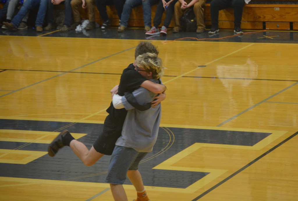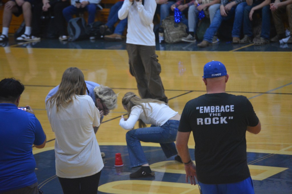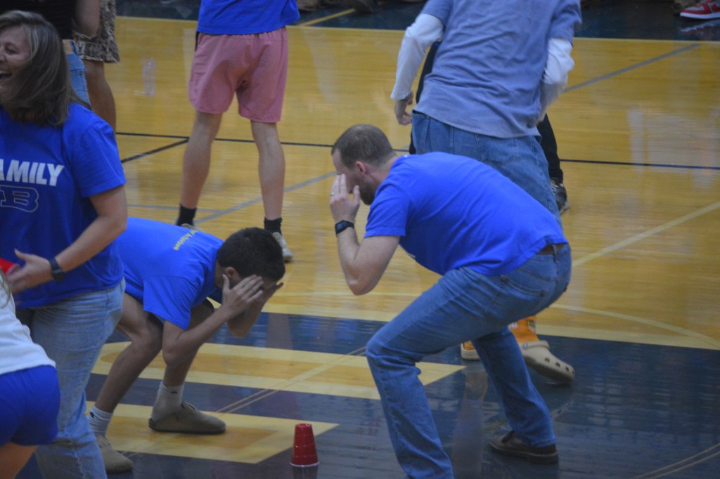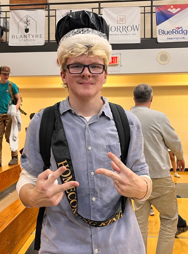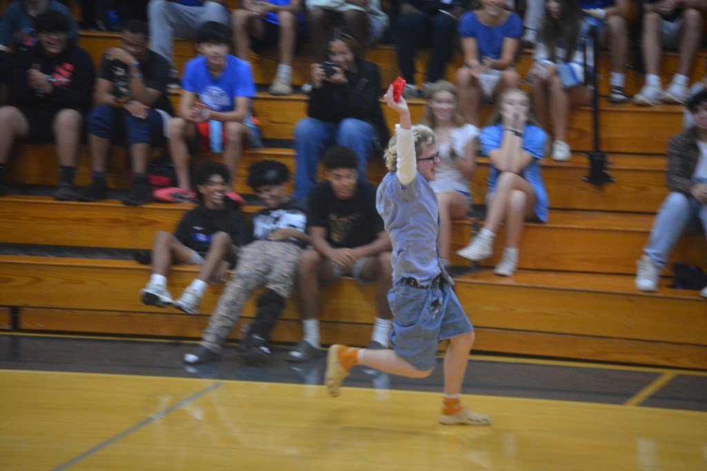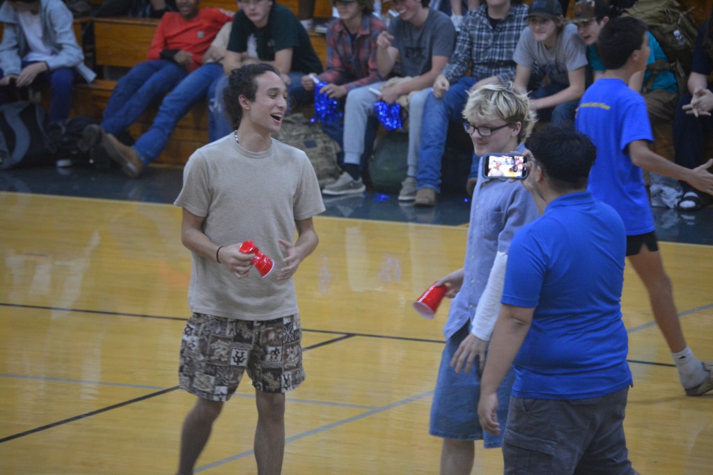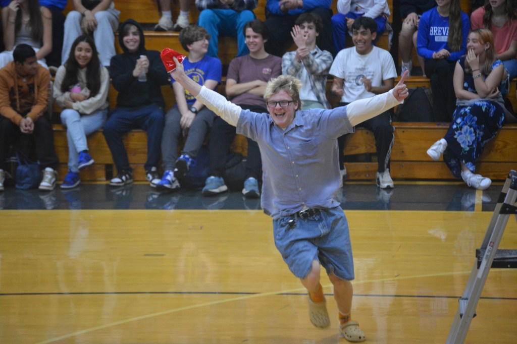 Homecoming King Brogen Justice celebrates after winning the cup race between students and teachers during the pep rally Friday. Photo by Rosa Olivares