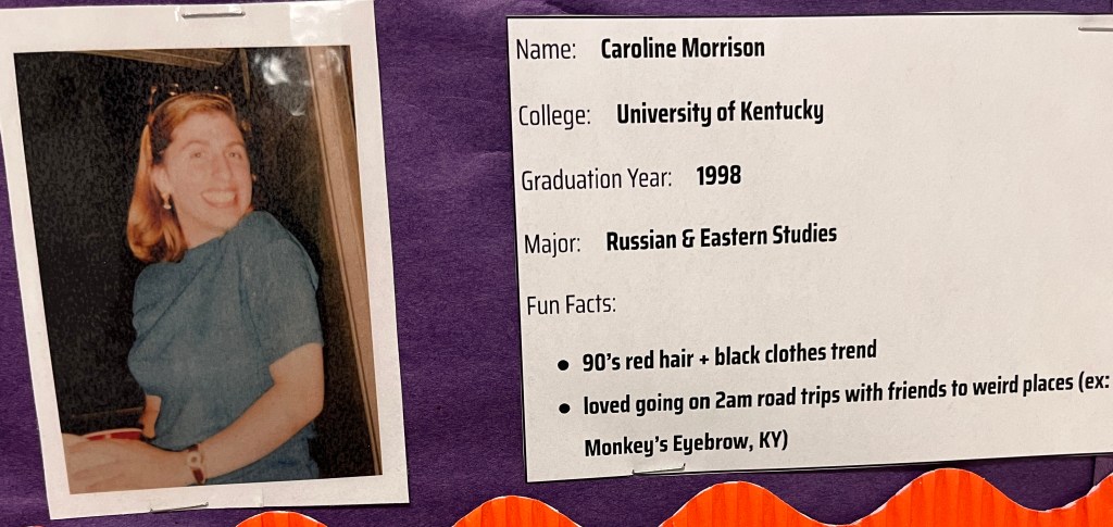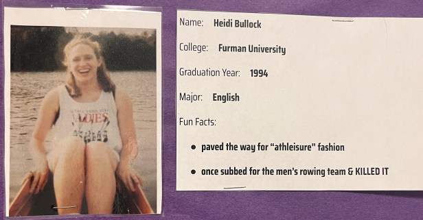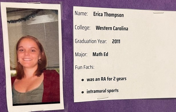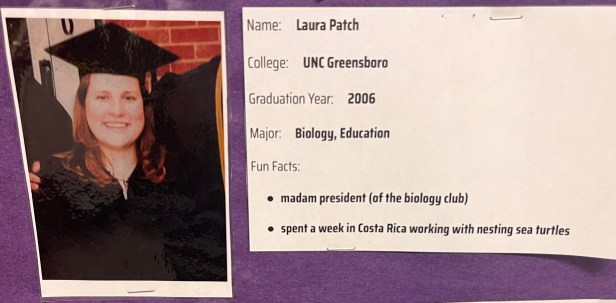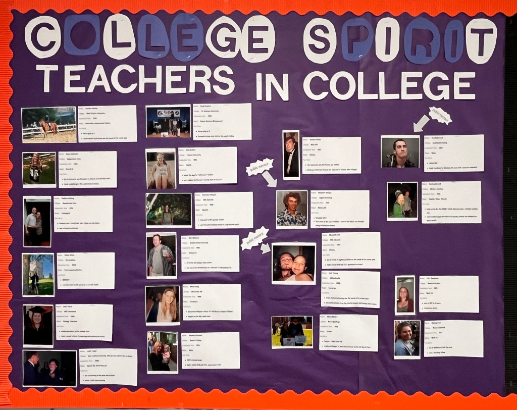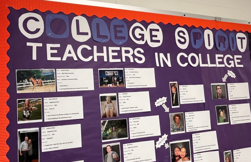To promote college spirit, College Advisor Lila Newman has created a “teachers in college” bulletin board that shows photos of teachers during their college years and shares some of their memories.