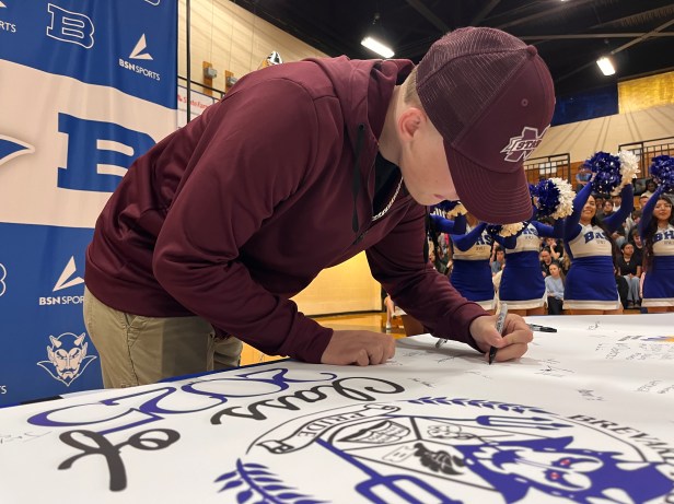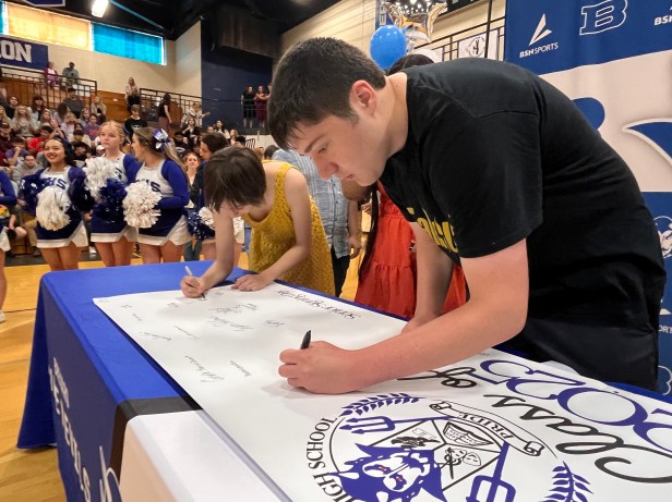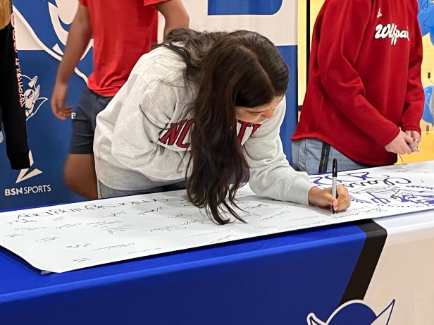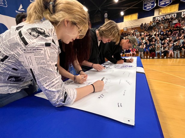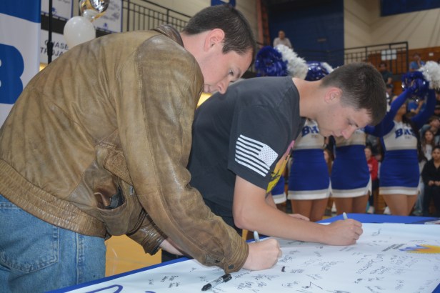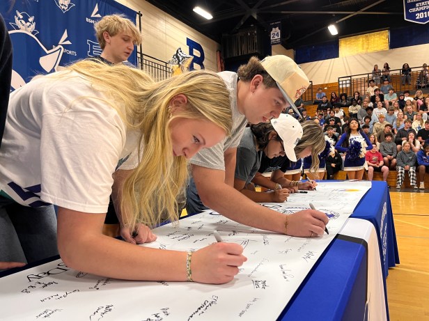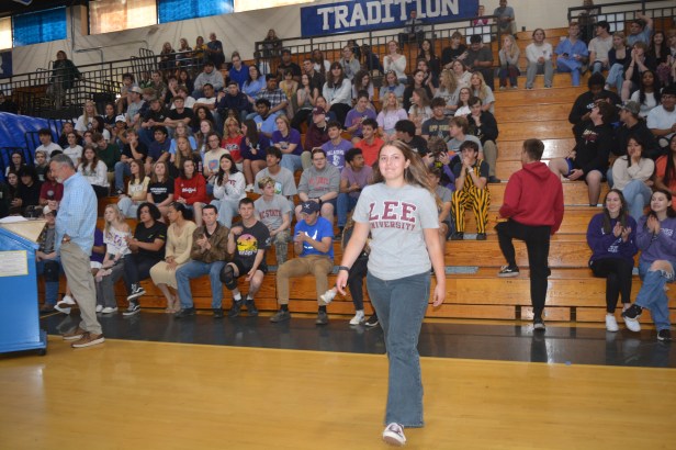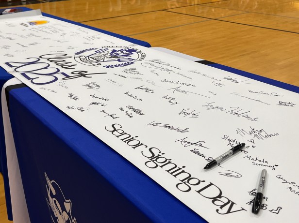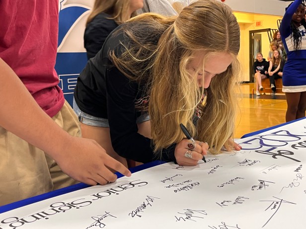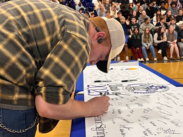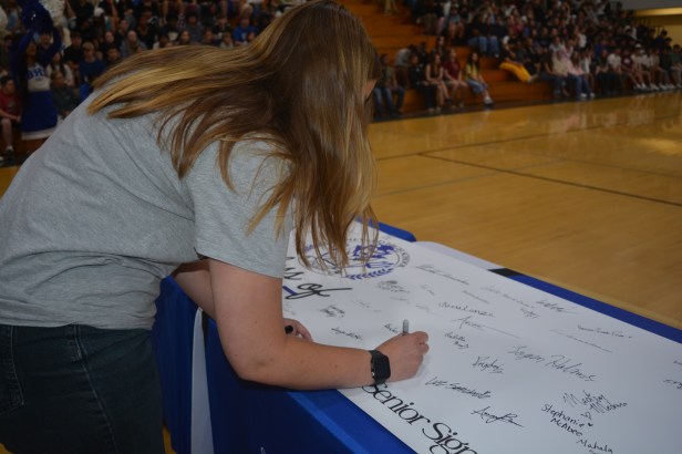 Seniors entered the gym through a tunnel to cheers from those in the packed gym. They were then called by name to sign the Class of 2025 banner and be recognized for their post-graduation decisions, whether they plan to attend a two- or four-year college, enlist in the military or enter the workforce.