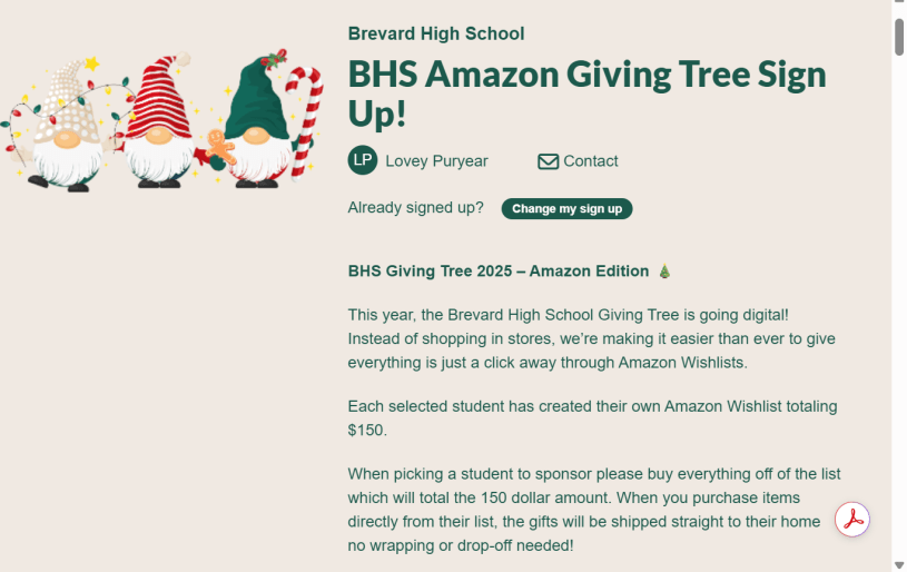 The link to donate is www.signupgenius.com/go/10C0845A8AB2BABFDC07-60170427-bhsamazon