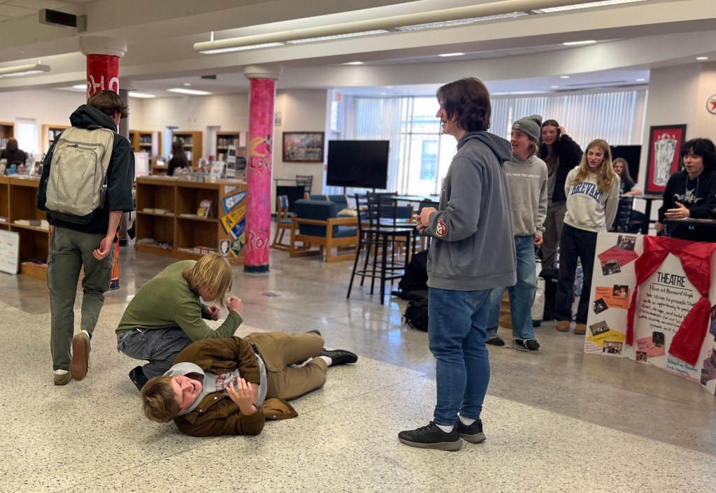 From left, Ian Merritt, Samuel White and Tyler Madison stage a mock “fight” to attract attention the Thespian Club during Wednesday’s Club Fair in the library.