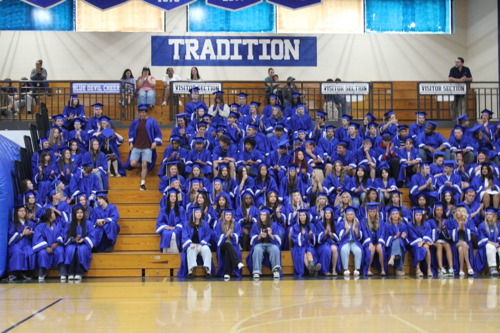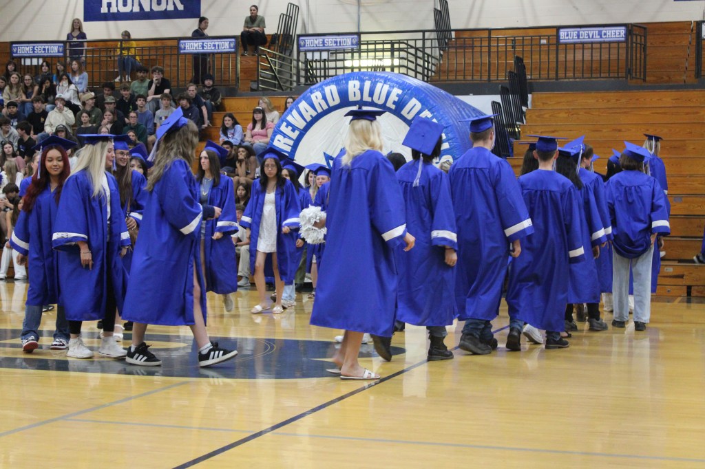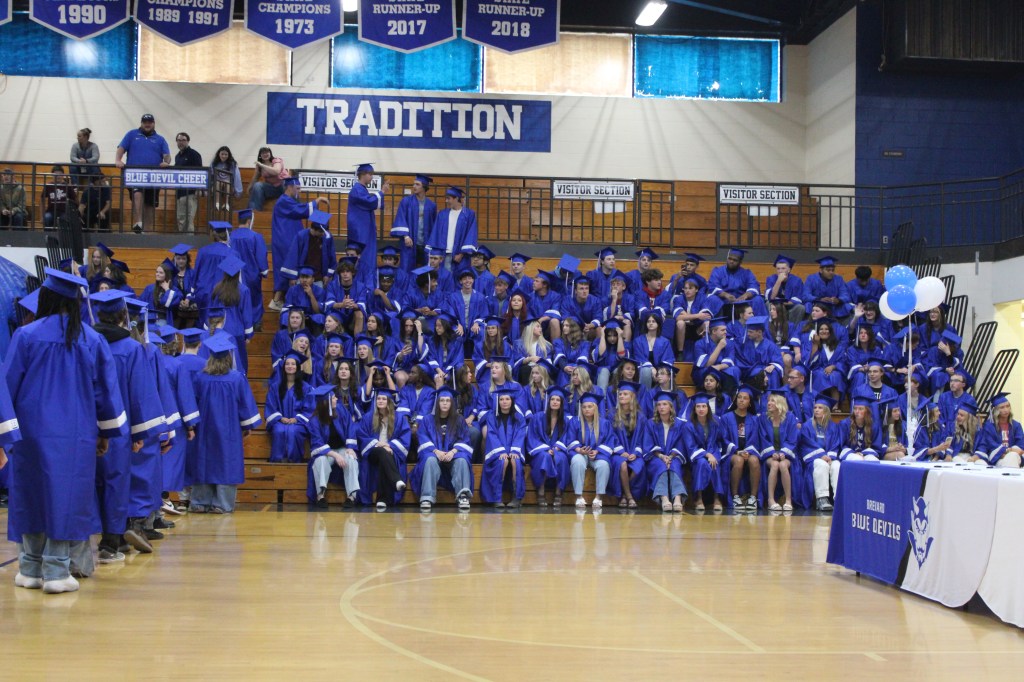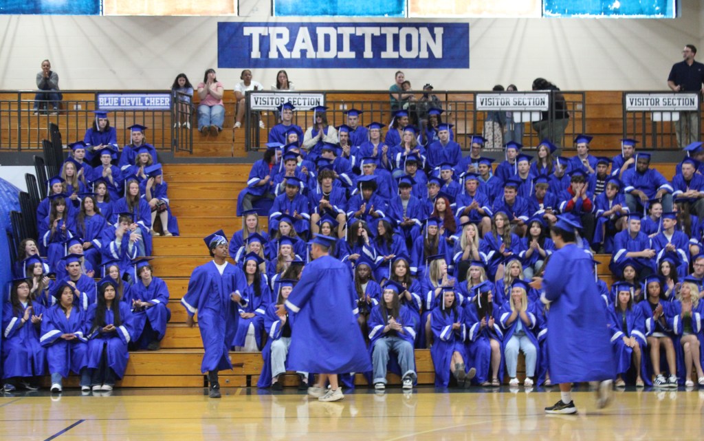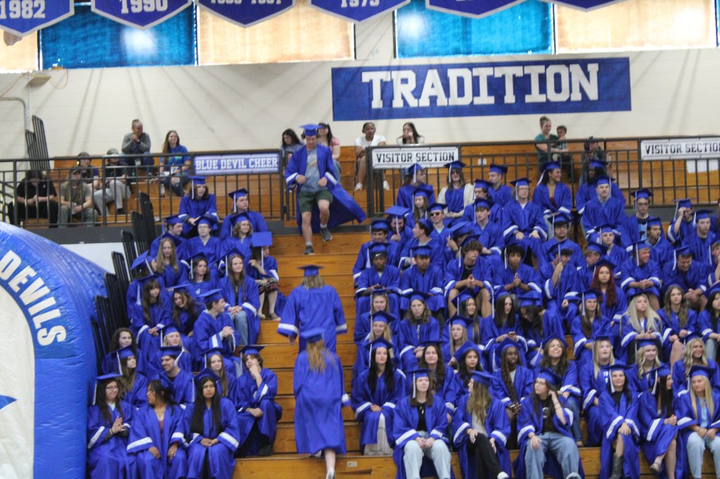 Grads wore their cap and gowns, many with college apparel underneath, and entered the gym through the Blue Devil tunnel.