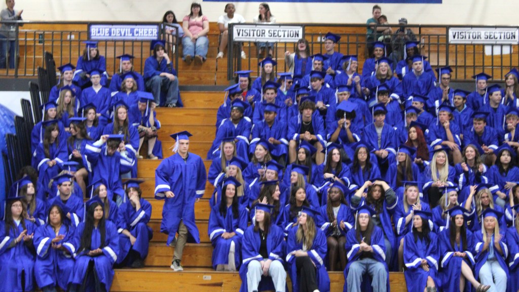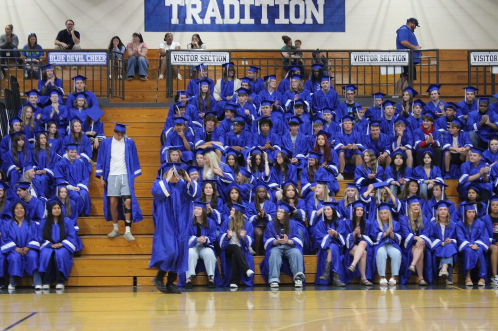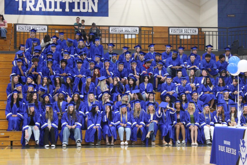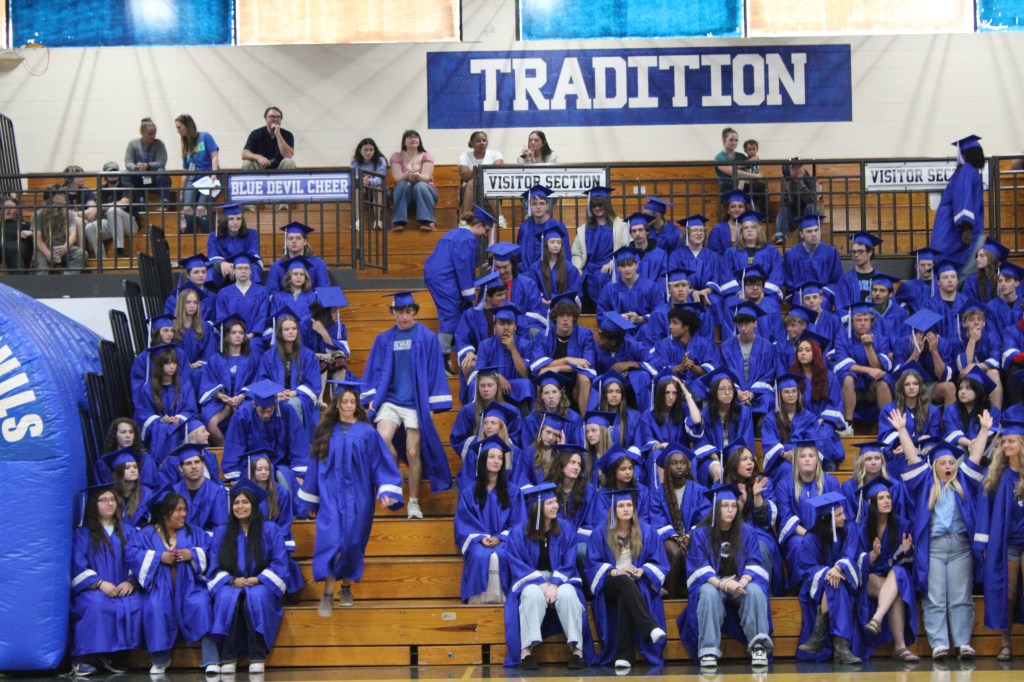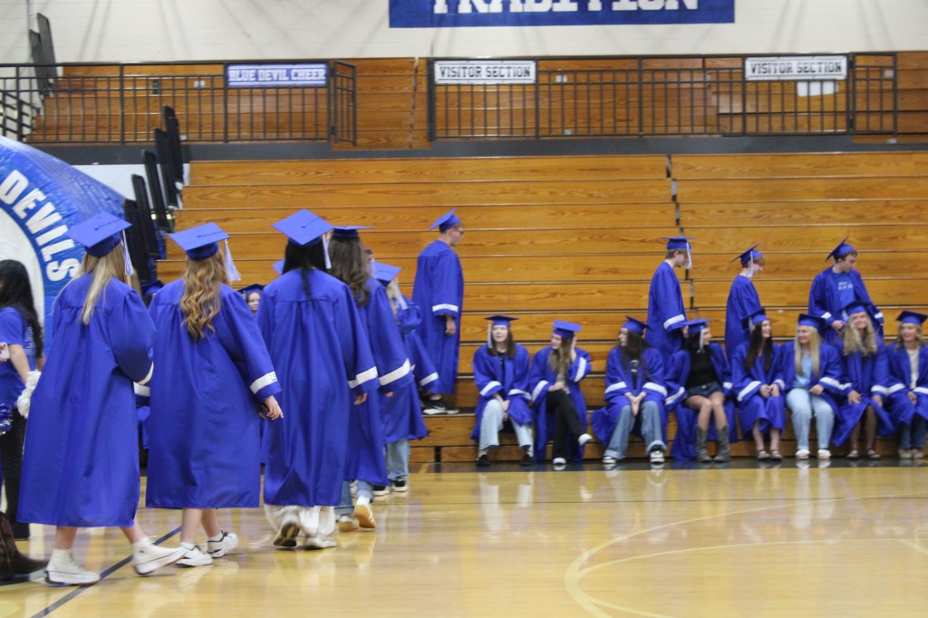 Grads wore their cap and gowns, many with college apparel underneath, and entered the gym through the Blue Devil tunnel.